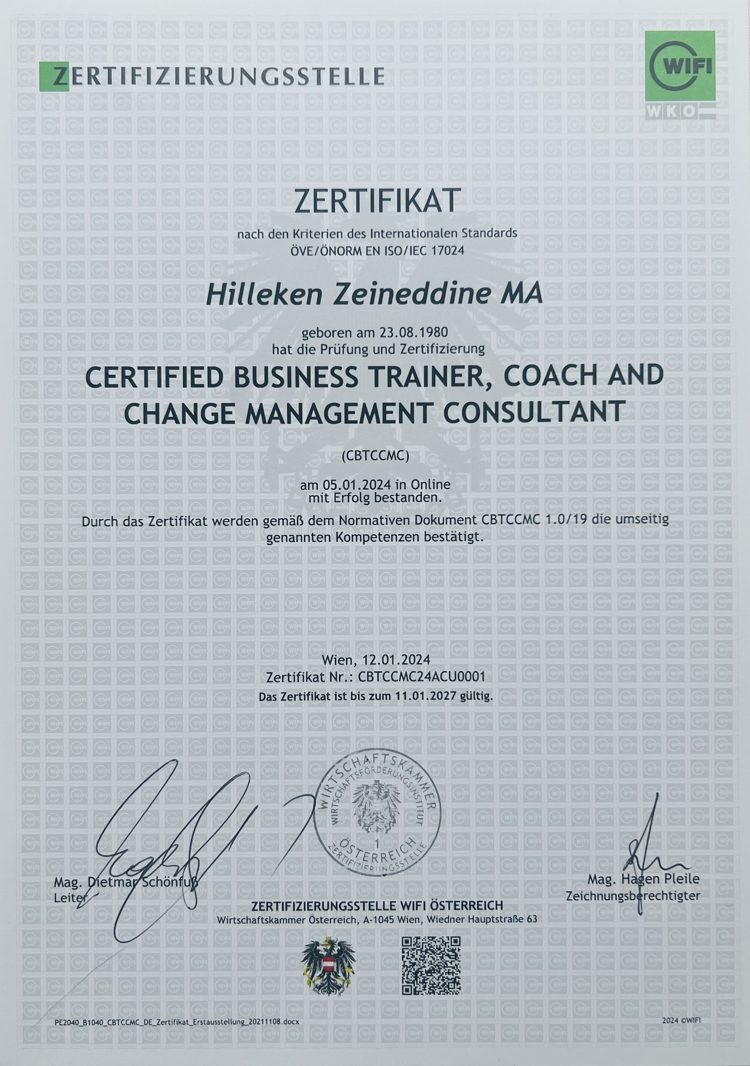 2024 Zertifizierung zum Certified Business Trainer, Coach and Change Management Consultant nach ÖVE/ÖNORM EN ISO/IEC 17024, WIFI